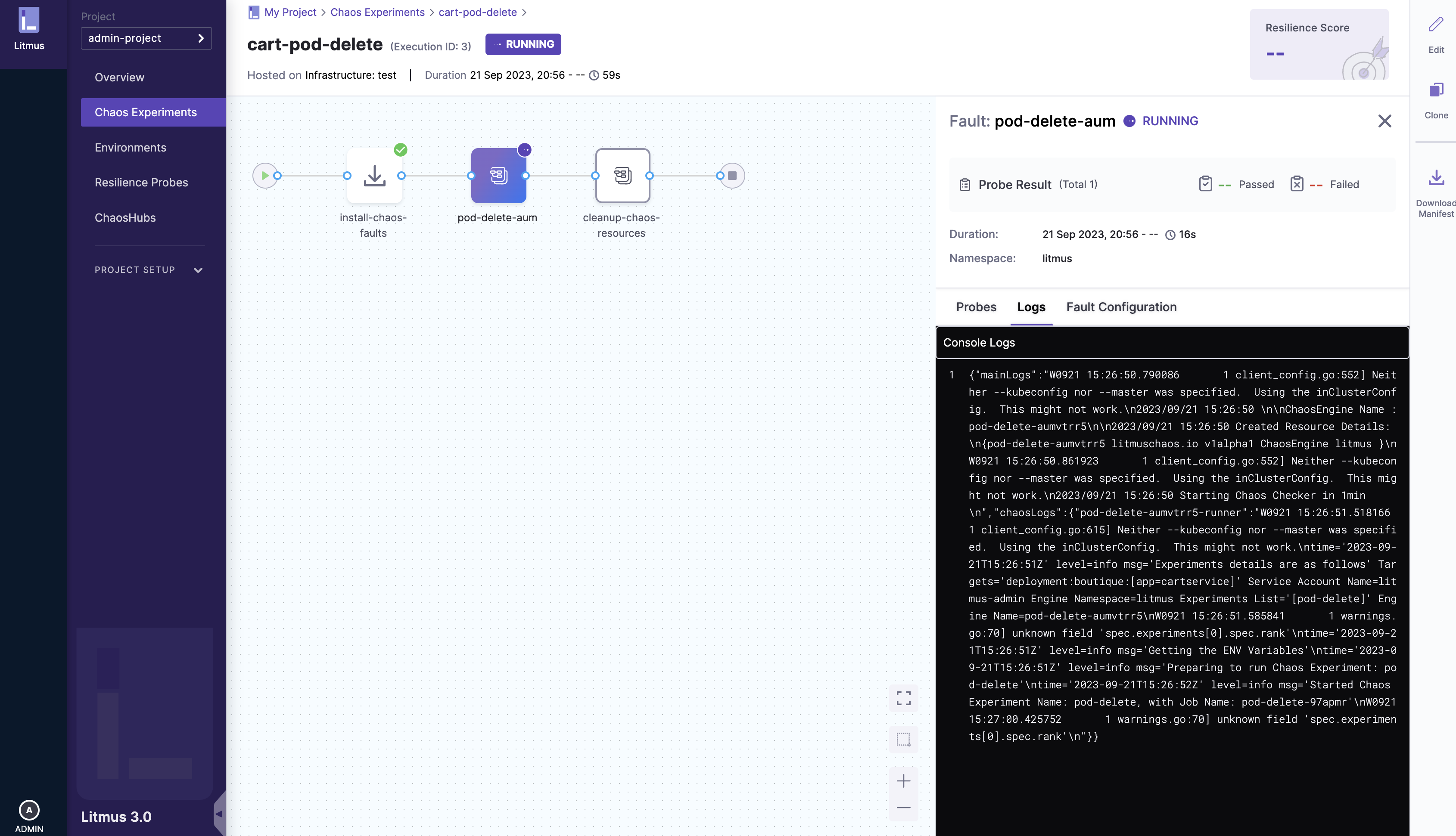 If the user chooses to Save and Run the experiment, they will be directed to the experiment execution page, where the experiment can be visualized. Otherwise, they will be taken to the chaos experiment page.