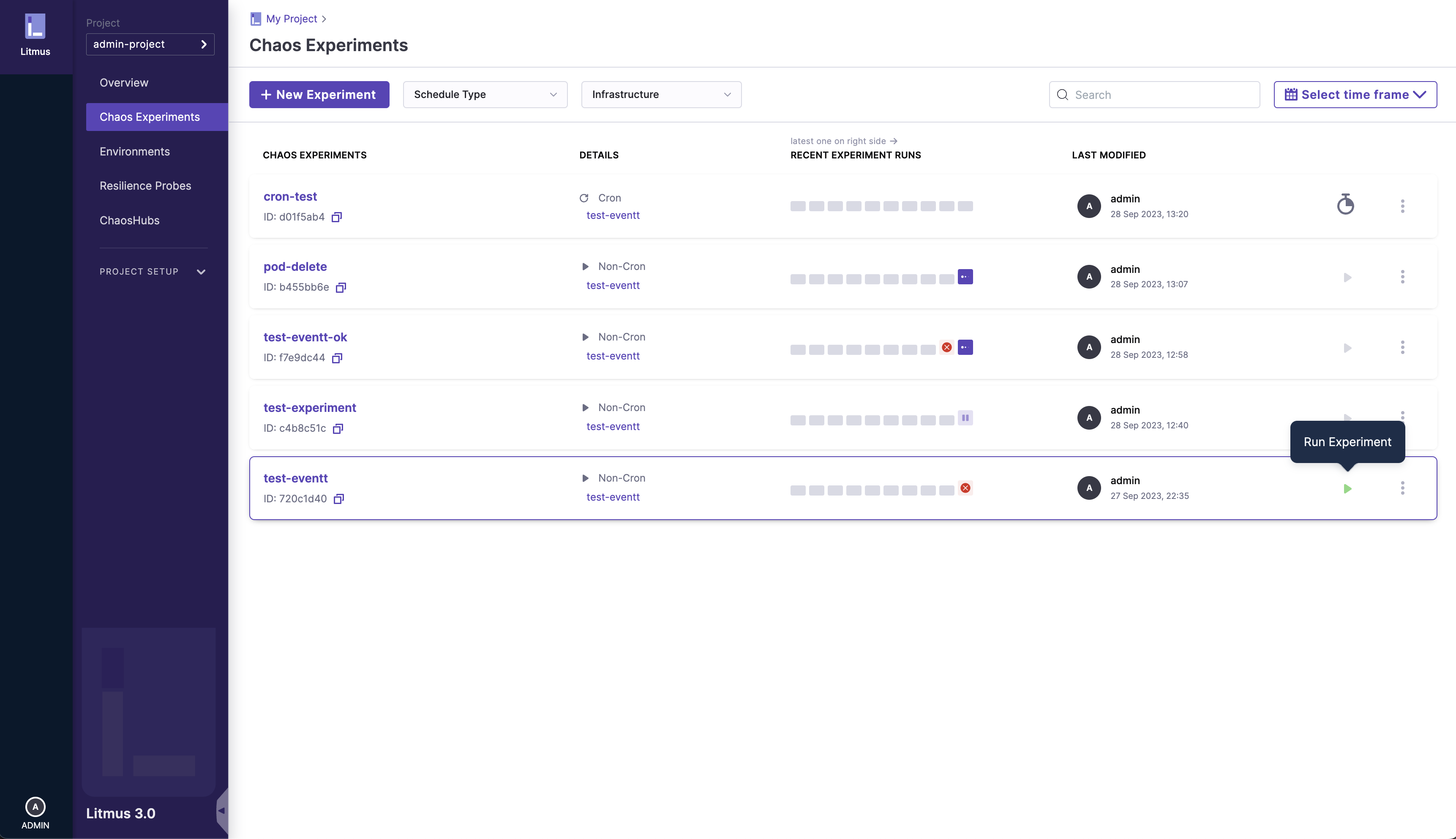 In the Chaos experiment page, and click on the play icon for the specific schedule you wish to re-run: