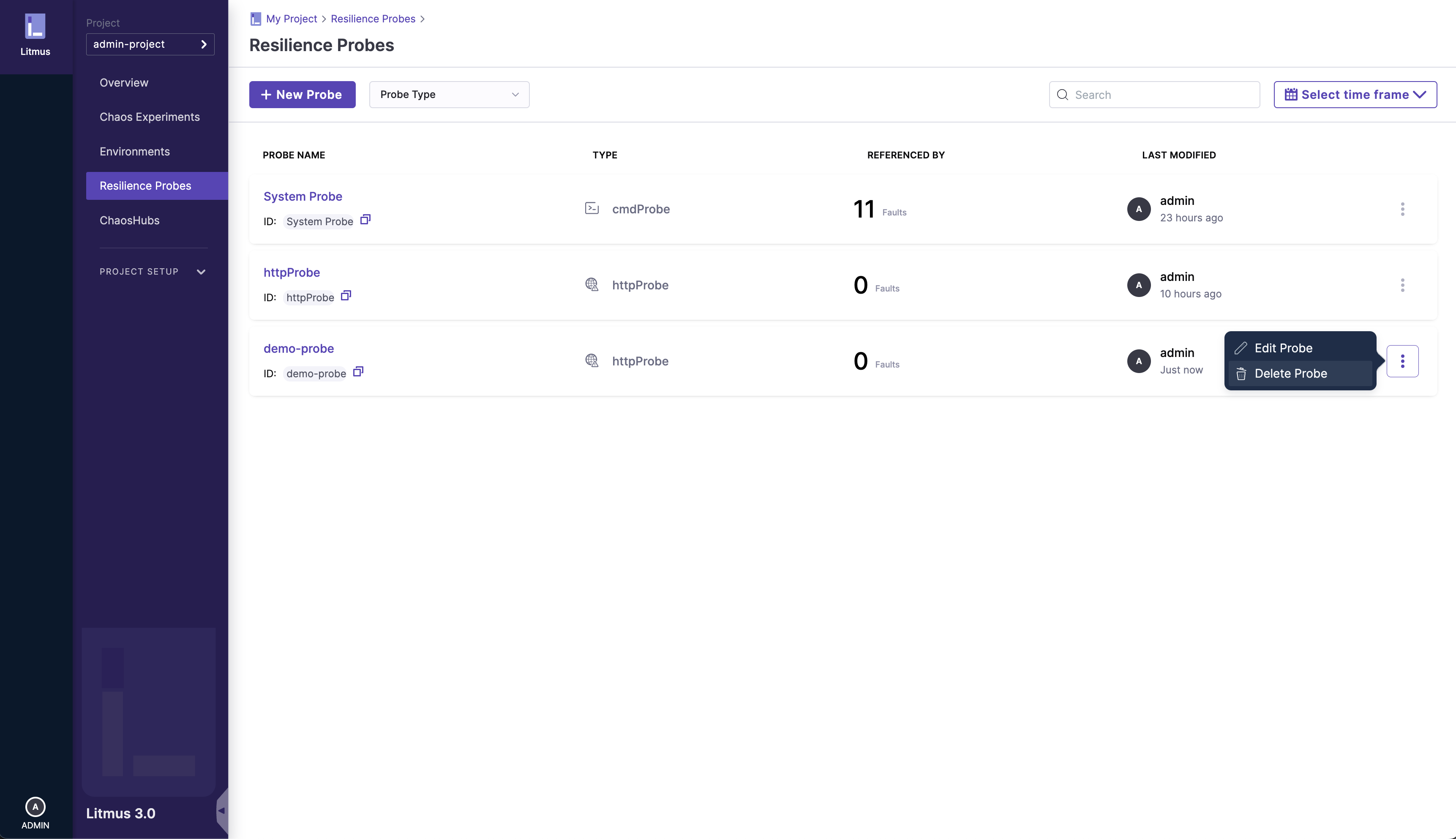 In the Resilience Probes page, go to the specific probe you wish to delete: