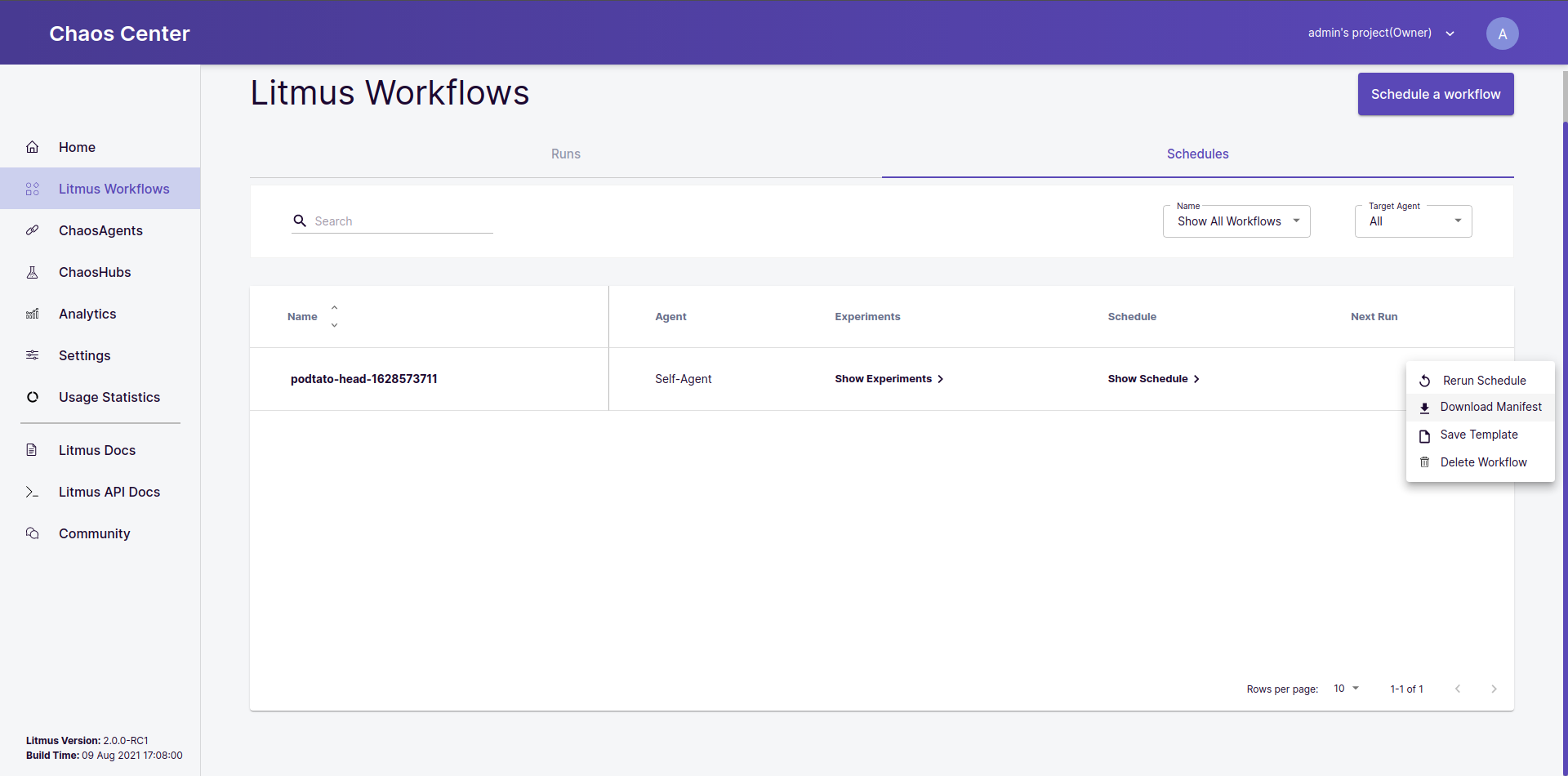 In the Chaos Scenario page, go to the Schedules tab and click on the options menu for the specific schedule you wish to download the manifest for: